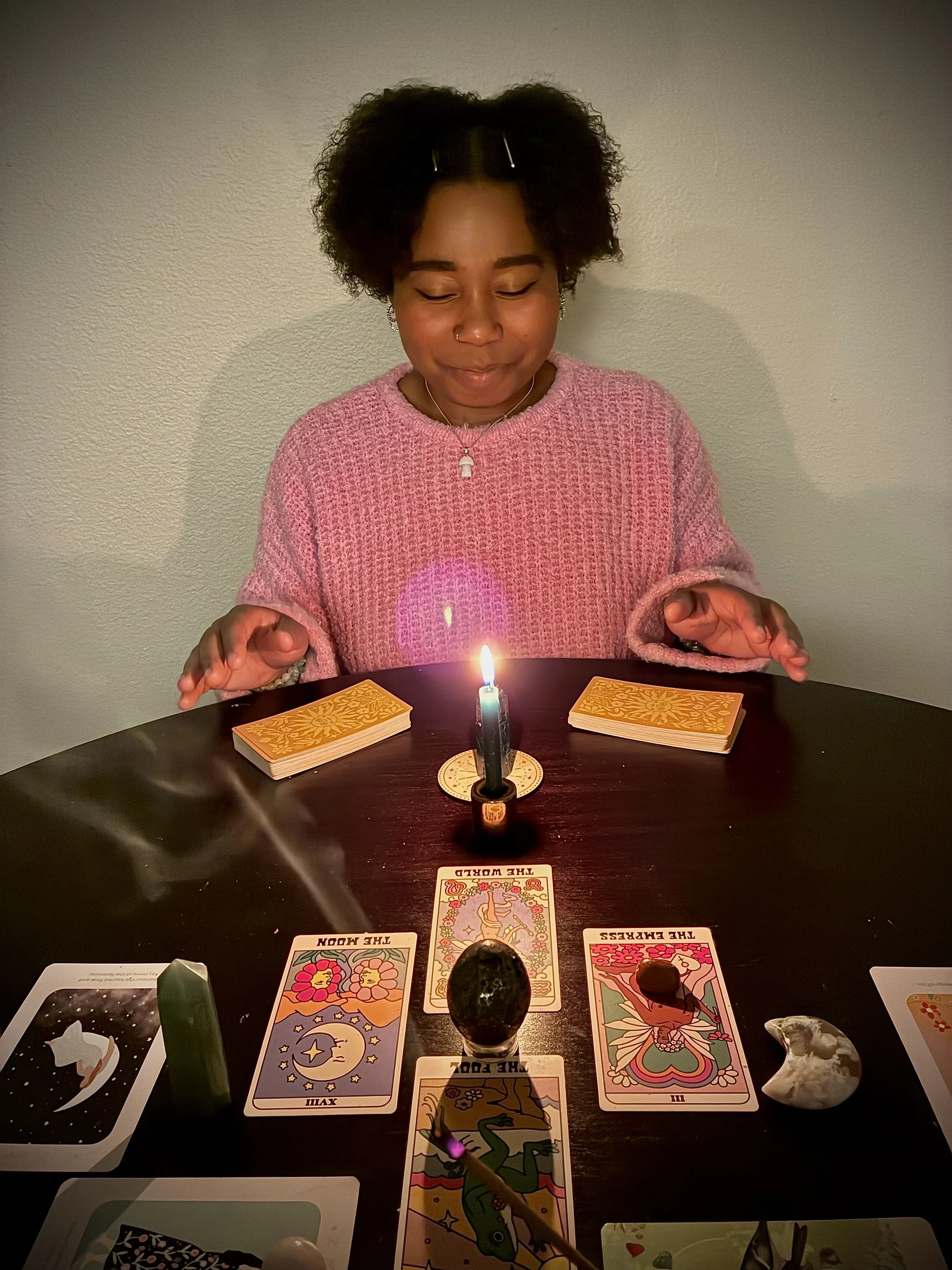 Through Tarot, Crystal healing, and daily spell work, I have strengthened my connection with the cosmos and my spirit guides to blossom into a fuller being grounded in the messages the world has to offer.